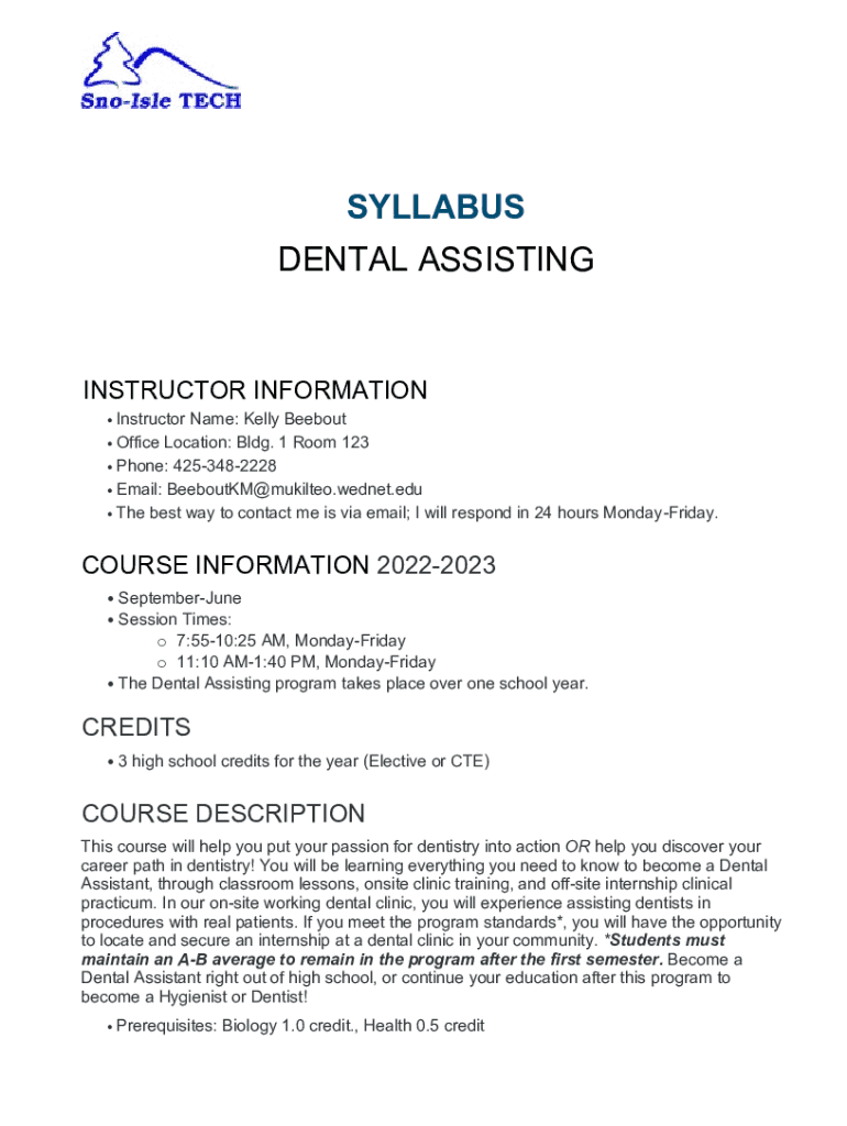 SYLLABUS DENTAL ASSISTINGINSTRUCTOR INFORMATION InstructorName: Kelly Bee bout Office Location: Bldg. 1 Room 123 Phone: 4253482228 Email: BeeboutKM@mukilteo.wednet.edu The best way to contact me is