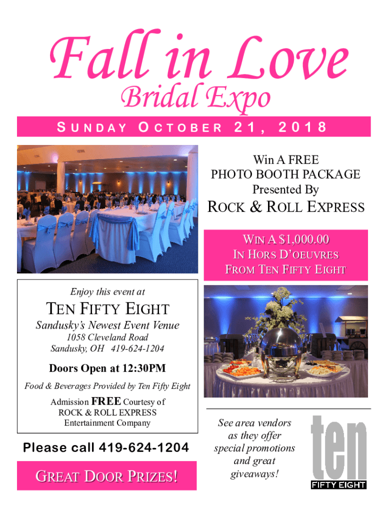 Bridal Expo S SUNDAY O OCTOBER 2 1, 2 0 1 8 Win A FREE PHOTO BOOTH PACKAGE Presented By ROCK & ROLL EXPRESS WIN A $1,000.00 IN HOURS OEUVRES FROM TEN FIFTY EIGHT Enjoy this event attend FIFTY EIGHT