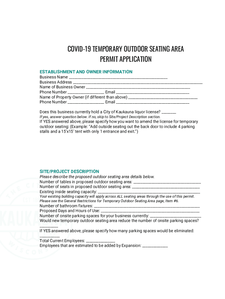 COVID-19 TEMPORARY OUTDOOR SEATING AREA PERMIT Application Common Council has authorized the appropriate City staff to assist local businesses to obtain necessary approvals to temporarily expand outdoor