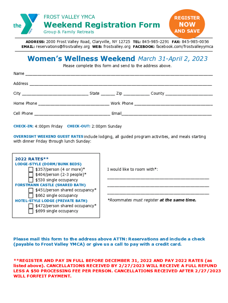 FROST VALLEY YMCAREGISTERWeekend Registration Form NOW AND Subgroup & Family RetreatsADDRESS: 2000 Frost Valley Road, Clarksville, NY 12725 TEL: 8459852291 FAX: 8459850056 EMAIL: reservations@frostvalley.org
