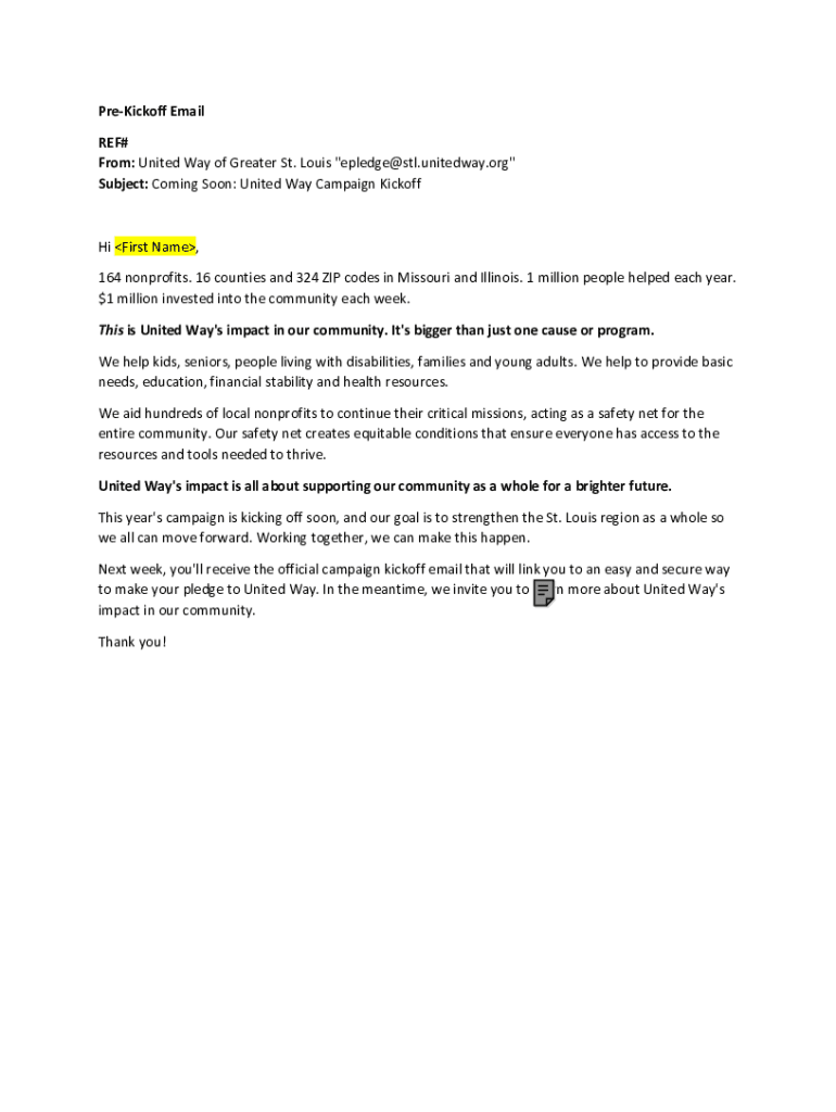 Kickoff Email REF# From: United Way of Greater St. Louis \”epledge@stl.unitedway.org\” Subject: Coming Soon: United Way Campaign Kickoff First Name, 164 nonprofits. 16 counties and 324 ZIP codes