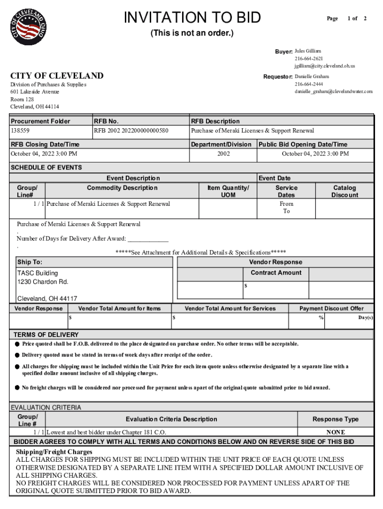 INVITATION TO BIDPage1 of2(This is not an order.) Buyer: Jules Gilliam 2166642621 jgilliam@city.cleveland.oh.usCITY OF CLEVELANDRequestor: Danielle Graham 2166642444 danielle_graham@clevelandwater.comDivision