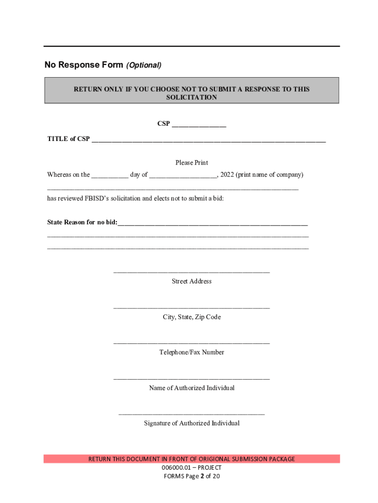 Statute / District Required Forms: No Response Form (Optional) Contractor Informational Form (Required) Contractor Questionnaire (Required) Bonding Capacity Certification Letter (Required) Proposal