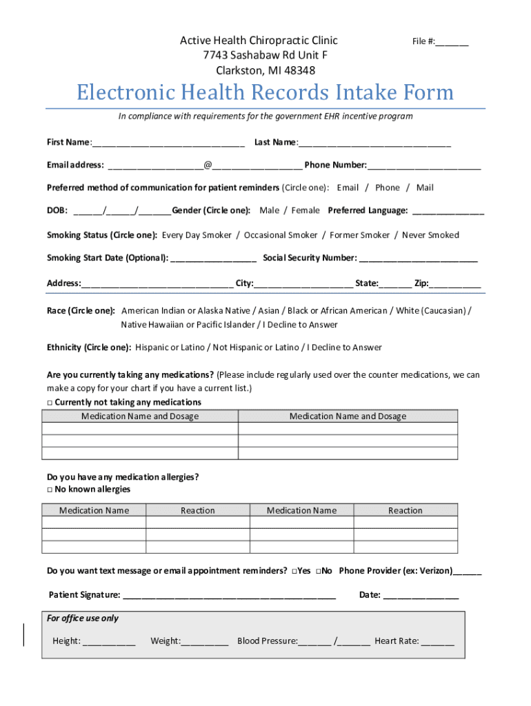 Active Health Chiropractic Clinic 7743 Sahara Rd Unit F Clarkson, MI 48348File #:___Electronic Health Records Intake Form In compliance with requirements for the government EHR incentive program First