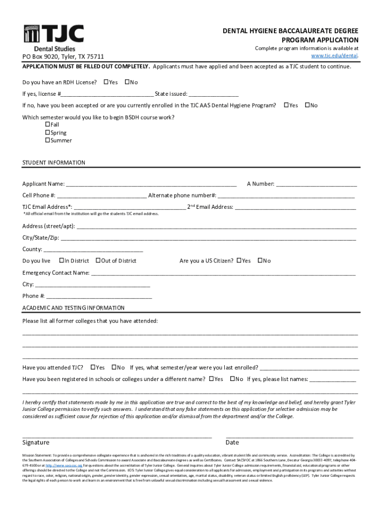 DENTAL HYGIENE BACCALAUREATE DEGREE PROGRAM APPLICATION Complete program information is available at www.tjc.edu/dental.PO Box 9020, Tyler, TX 75711APPLICATION MUST BE FILLED OUT COMPLETELY. Applicants