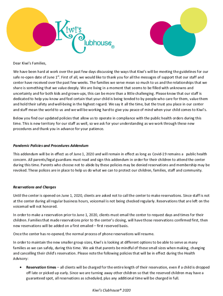 Dear Kiwis Families, We have been hard at work over the past few days discussing the ways that Kiwis will be meeting the guidelines for our safe reopen date of June 1st. First, we would like to thank