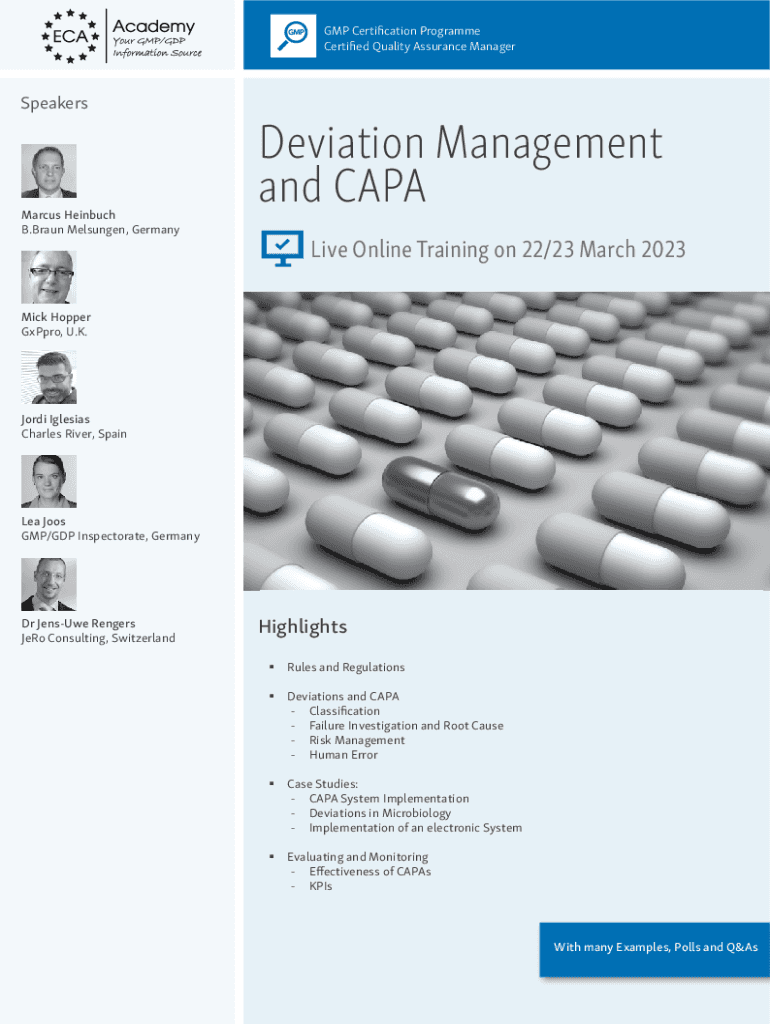 GMP Certification Program Certified Quality Assurance ManagerSpeakersMarcus Heinrich B. Braun Messenger, GermanyDeviation Management and CAP Live Online Training on 22/23 March 2023Mick Hopper GoPro,