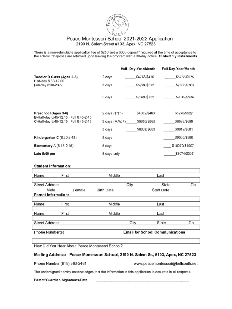 Peace Montessori School 20212022 Application 2190 N. Salem Street #103, Apex, NC 27523 There is a nonrefundable application fee of $250 and a $300 deposit* required at the time of acceptance to the