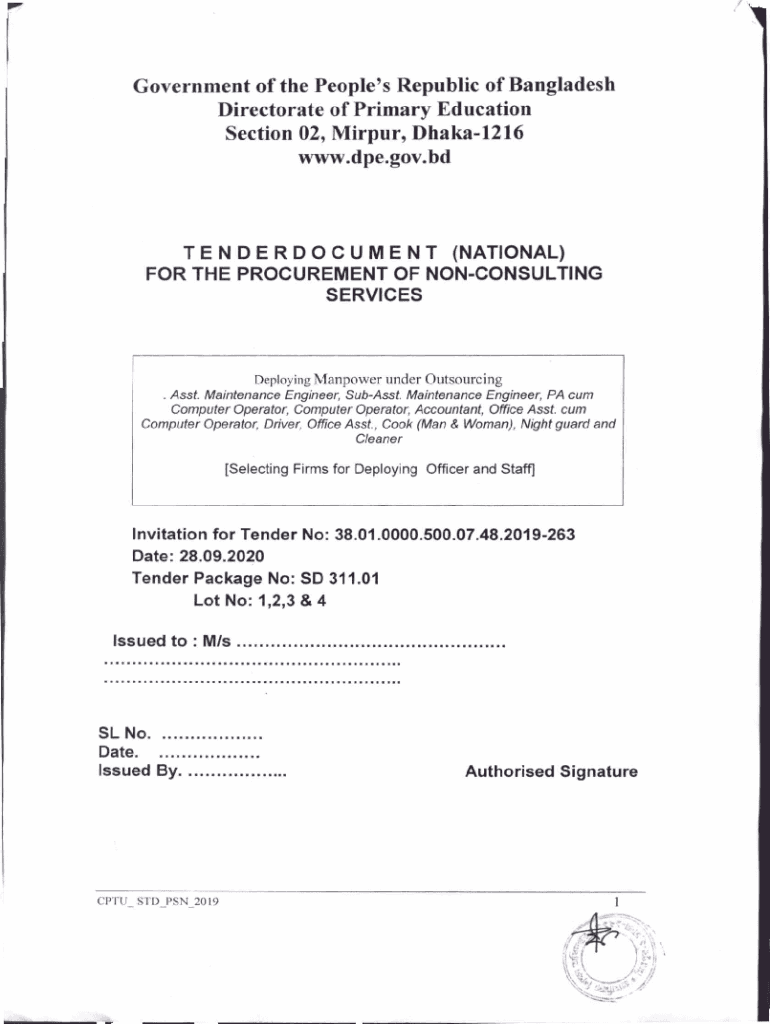 Government of the People\'s Republic of Bangladesh Directorate of Primary Education Section 02, Mirror, Dhaka1216 www.dpe.gov.bdTENDERDOCUMENT (NATIONAL) FOR THE PROCUREMENT OF NONCONDUCTING SERVICESDeploying