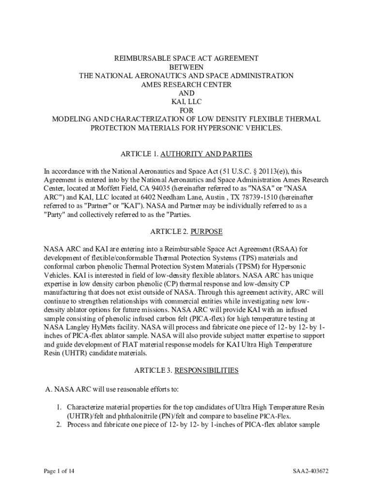 REIMBURSABLE SPACE ACT AGREEMENT BETWEEN THE NATIONAL AERONAUTICS AND SPACE ADMINISTRATION AMES RESEARCH CENTER AND KAI, LLC FOR MODELING AND CHARACTERIZATION OF LOW DENSITY FLEXIBLE THERMAL PROTECTION