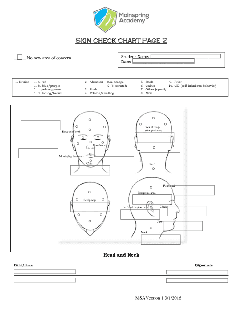 Skin check chart Page 2 Student Name: ___ Date: ______ No new area of concern1. Bruise1. 1. 1. 1.a. red b. blue/purple c. yellow/green d. fading/brown2. Abrasion2.a. scrape 2. b. scratch5. 6. 7. 8.3.