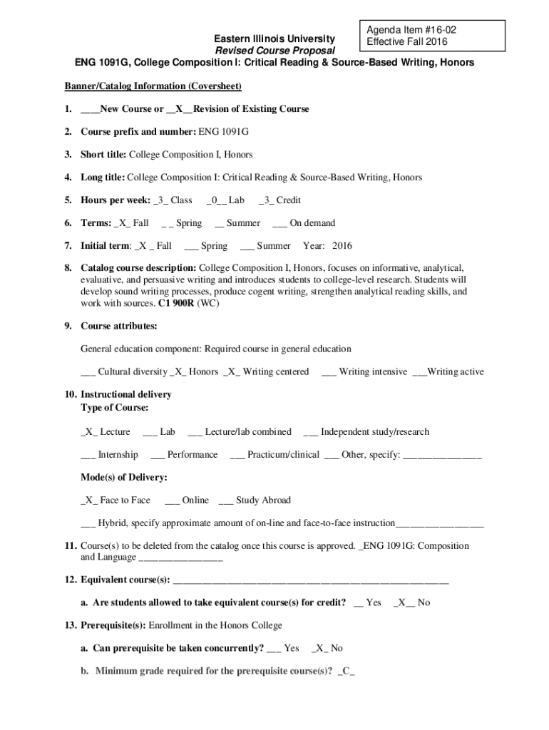 Agenda Item #1602 Eastern Illinois University Effective Fall 2016 Revised Course Proposal ENG 1091G, College Composition I: Critical Reading & Surceased Writing, Honors Banner/Catalog Information