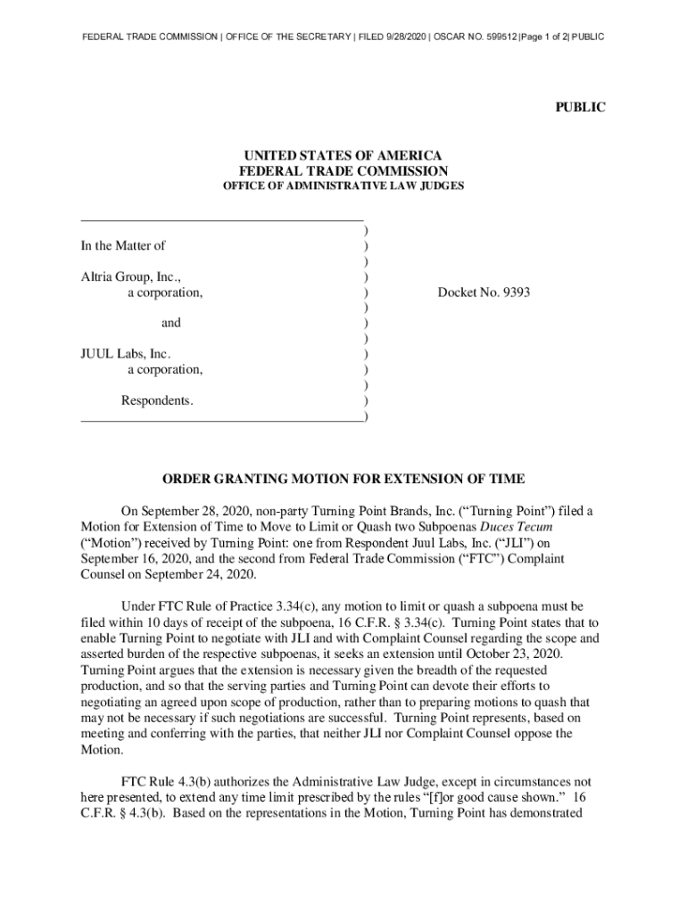 FEDERAL TRADE COMMISSION | OFFICE OF THE SECRETARY | FILED 9/28/2020 | OSCAR NO. 599512 |Page 1 of 2| PUBLICPUBLICUNITED STATES OF AMERICA FEDERAL TRADE COMMISSION OFFICE OF ADMINISTRATIVE LAW JUDGES___)