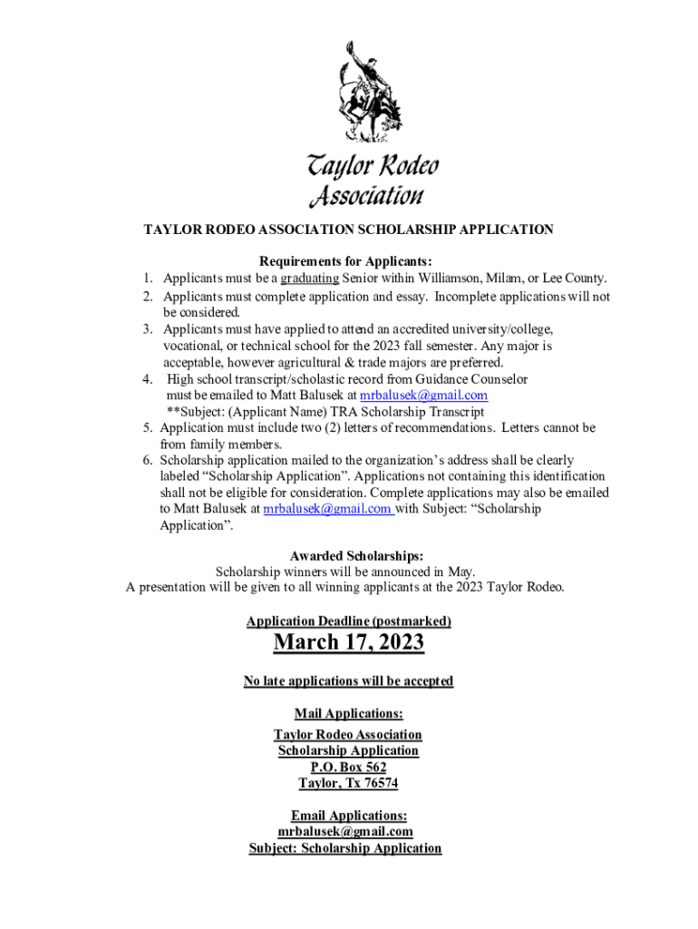 TAYLOR RODEO ASSOCIATION SCHOLARSHIP APPLICATION 1. 2. 3. 4. 5. 6. Requirements for Applicants: Applicants must be a graduating from Senior within Williamson, Milan, or Lee County. Applicants must