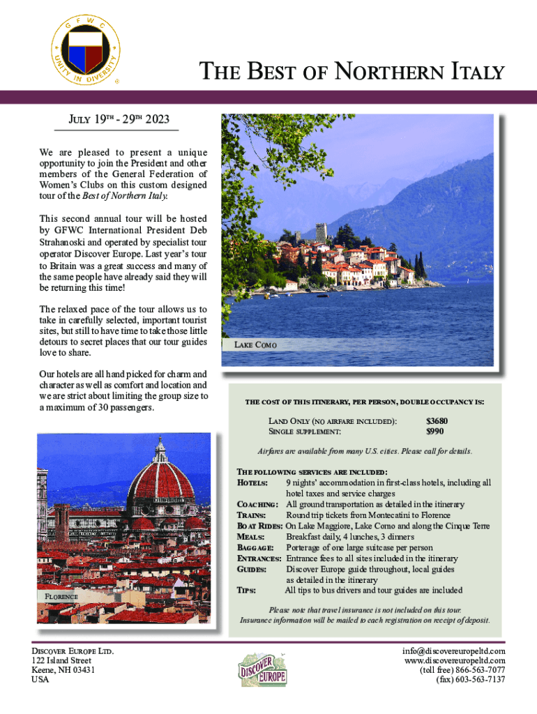 The Best of Northern Italy July 19th 29th 2023 We are pleased to present a unique opportunity to join the President and other members of the General Federation of Women's Clubs on this custom designed