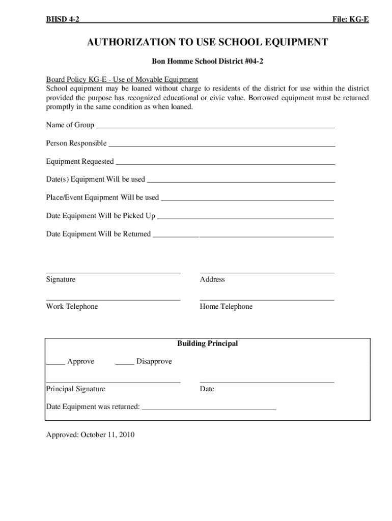 BSD 42File: PREAUTHORIZATION TO USE SCHOOL EQUIPMENT On Home School District #042 Board Policy AGE Use of Movable Equipment School equipment may be loaned without charge to residents of the district