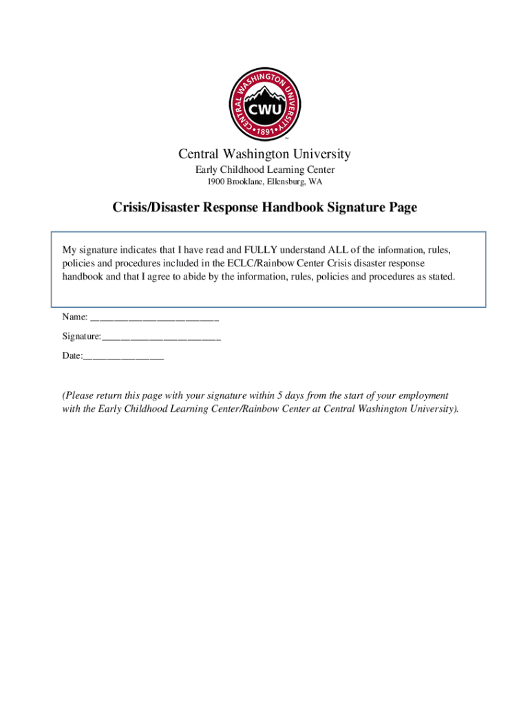 Central Washington University Early Childhood Learning Center 1900 Brook lane, Ellensburg, Crisis/Disaster Response Handbook Signature Page My signature indicates that I have read and FULLY understand