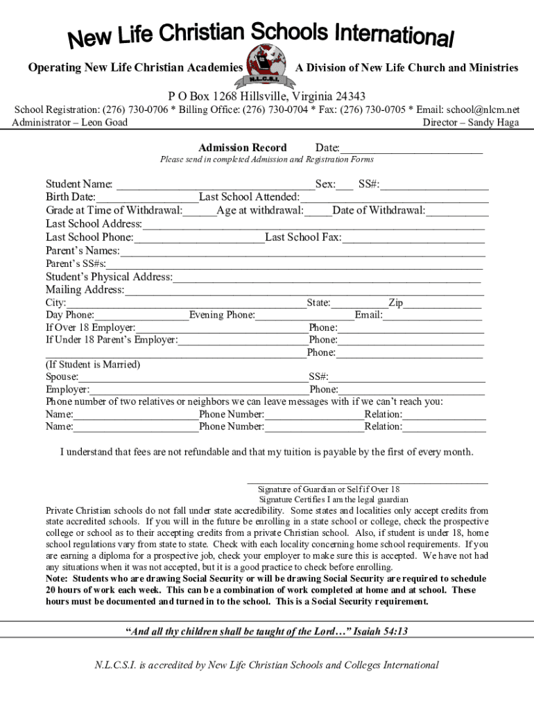 Operating New Life Christian Academies Division of New Life Church and Ministries O Box 1268 Hinesville, Virginia 24343 School Registration: (276) 7300706 * Billing Office: (276) 7300704 * Fax: (276)