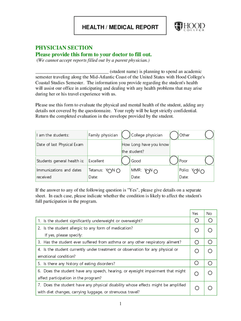 HEALTH / MEDICAL REPORTPHYSICIAN SECTION Please provide this form to your doctor to fill out. (We cannot accept reports filled out by a parent physician.) ___ (student name) is planning to spend an
