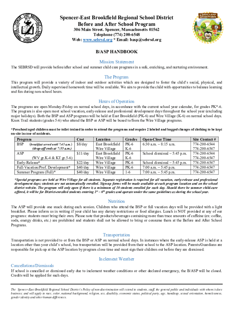 Spencer East Brookfield Regional School District Before and After School Program 306 Main Street. Spencer, Massachusetts 01562 Telephone (774) 2006548 Web: www.sebrsd.org * Email: basp@sebrsd.orgB/ASP