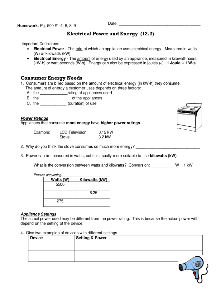 Date: ___Homework: Pg. 500 #14, 6, 8, 9Electrical Power and Energy (12.2) Important Definitions: Electrical Power The rate at which an appliance uses electrical energy. Measured in watts (W) or kilowatts