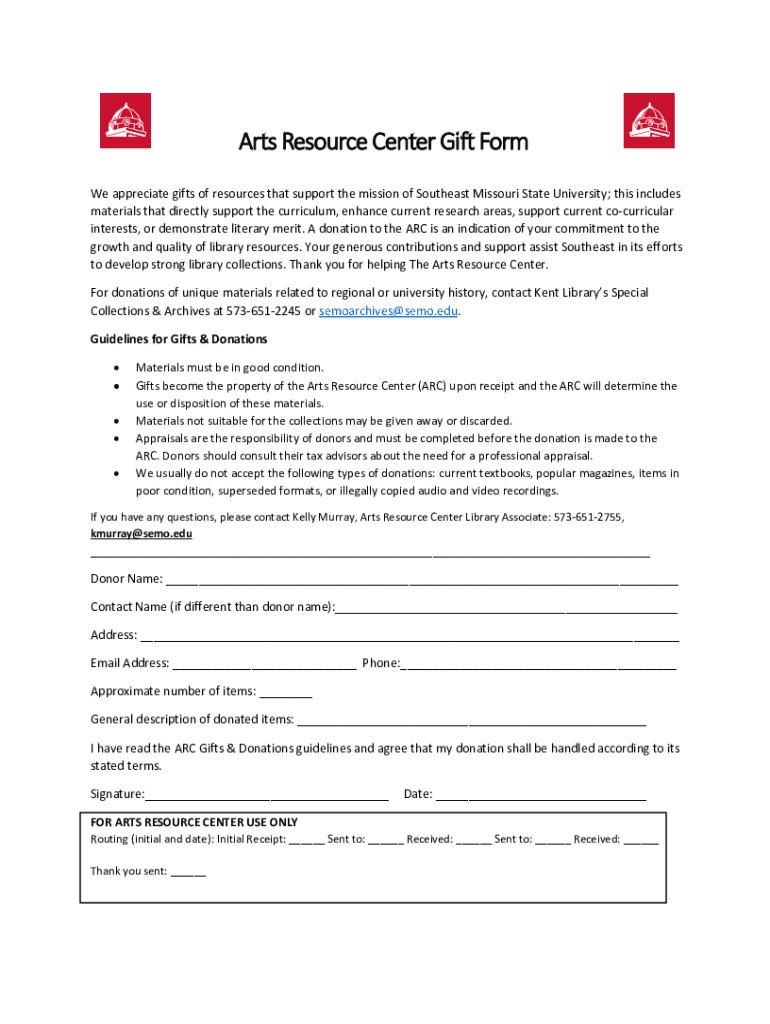 Arts Resource Center Gift Form We appreciate gifts of resources that support the mission of Southeast Missouri State University; this includes materials that directly support the curriculum, enhance
