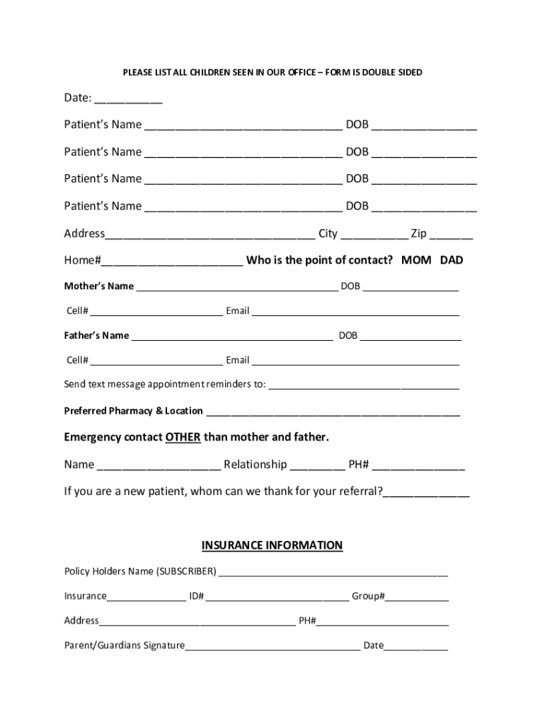 PLEASE LIST ALL CHILDREN SEEN IN OUR OFFICE FORM IS DOUBLE Sedate: ___ Patients Name ___ DOB ___ Patients Name ___ DOB ___ Patients Name ___ DOB ___ Patients Name ___ DOB ___ Address___ City ___ Zip