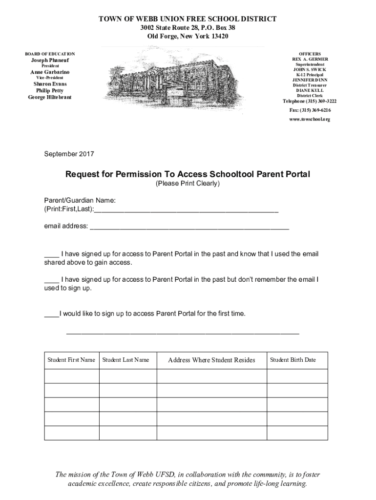 TOWN OF WEBB UNION FREE SCHOOL DISTRICT 3002 State Route 28, P.O. Box 38 Old Forge, New York 13420 BOARD OF EDUCATIONOFFICERS REX A. GERBER Superintendent JOHN S. SICK K12 Principal JENNIFER DUNN