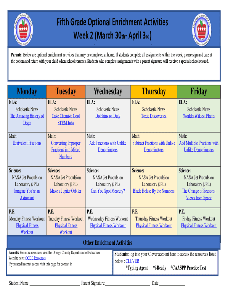 Fifth Grade Optional Enrichment Activities Week 2 (March 30th April 3rd) Week 1 (March 16 March 20)MondayTuesdayWednesdayELA: Scholastic News The Amazing History of Dogs ELA: Scholastic News Cake