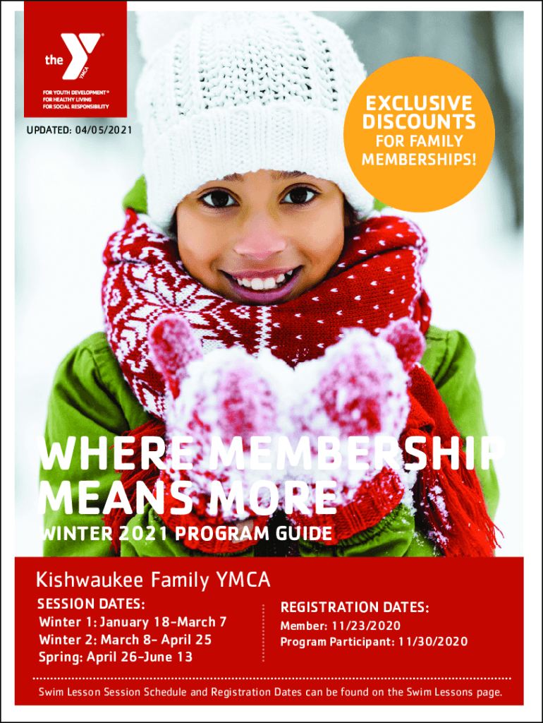 EXCLUSIVE DISCOUNTSUPDATED: 04/05/2021FOR FAMILY MEMBERSHIPS!WHERE MEMBERSHIP MEANS MORE WINTER 2021 PROGRAM GUIDEKishwaukee Family YMCA SESSION DATES: Winter 1: January 18March 7Winter 2: March 8