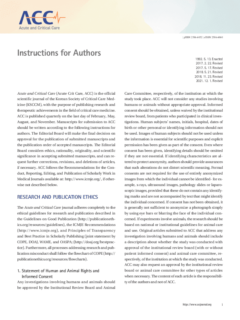 | ISSN 25866052 | ISSN 25866060Instructions for AuthorsAcute and Critical Care (Acute CRT Care, ACC) is the official scientific journal of the Korean Society of Critical Care Medicine (KSCM), with