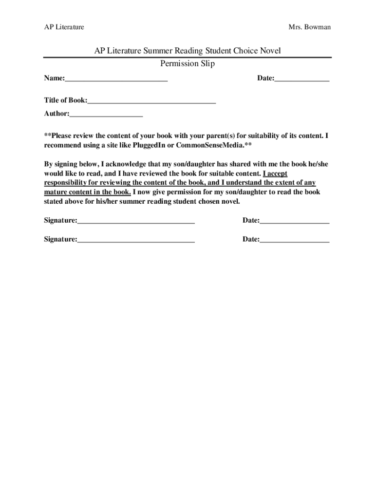 AP Literature Mrs. Bowman AP Literature Summer Reading Student Choice Novel Permission Slip Name:___Date:___Title of Book:___ Author:___ **Please review the content of your book with your parent(s)