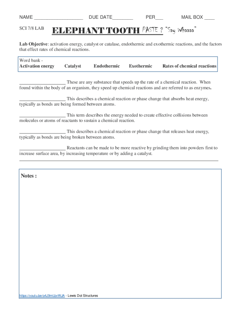 SCI 7/8 ABDUL DATE___PER___MAIL BOX ___ELEPHANT TOOTH PASTE ? Say WhaaaaLab Objective: activation energy, catalyst or catalase, endothermic and exothermic reactions, and the factors