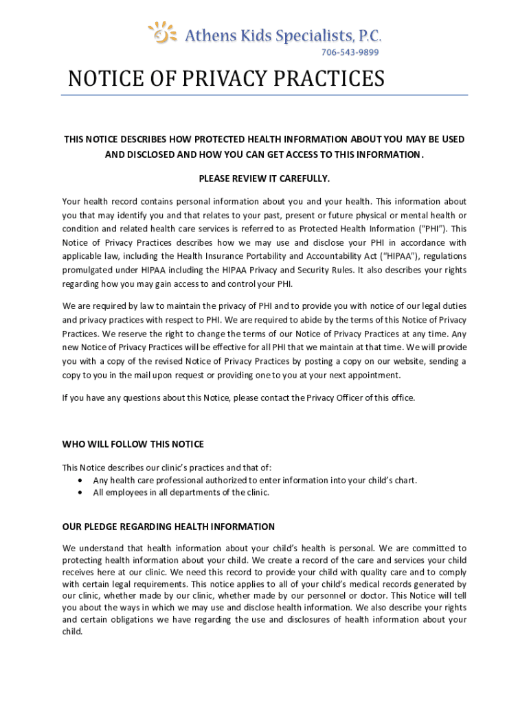 NOTICE OF PRIVACY PRACTICES THIS NOTICE DESCRIBES HOW PROTECTED HEALTH INFORMATION ABOUT YOU MAY BE USED AND DISCLOSED AND HOW YOU CAN GET ACCESS TO THIS INFORMATION. PLEASE REVIEW IT CAREFULLY. Your