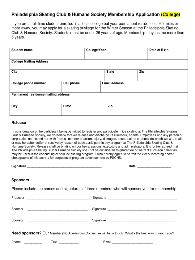 Philadelphia Skating Club & Humane Society Membership Application (College) If you are a full time student enrolled in a local college, but your permanent residence is 60 miles or more away, you may