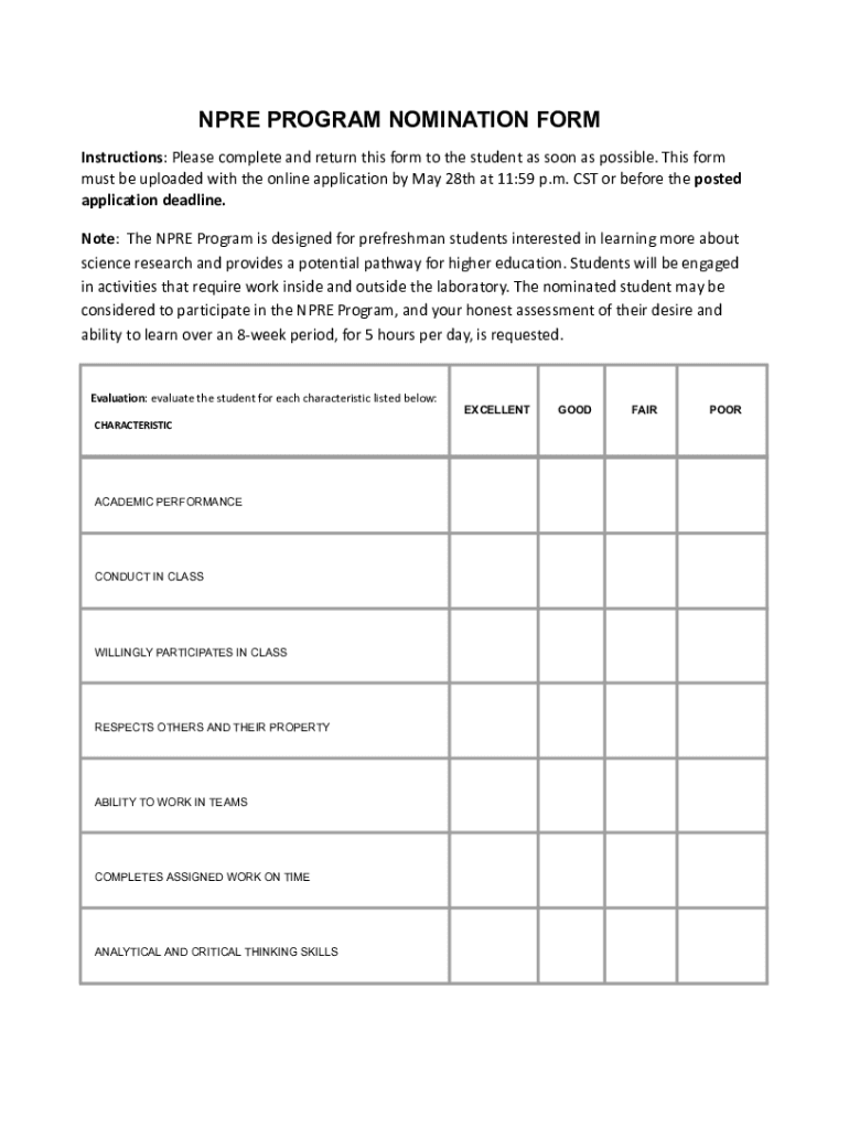 The npre program nomination form typically requires information about the nominee, the program, and the reason for the nomination.