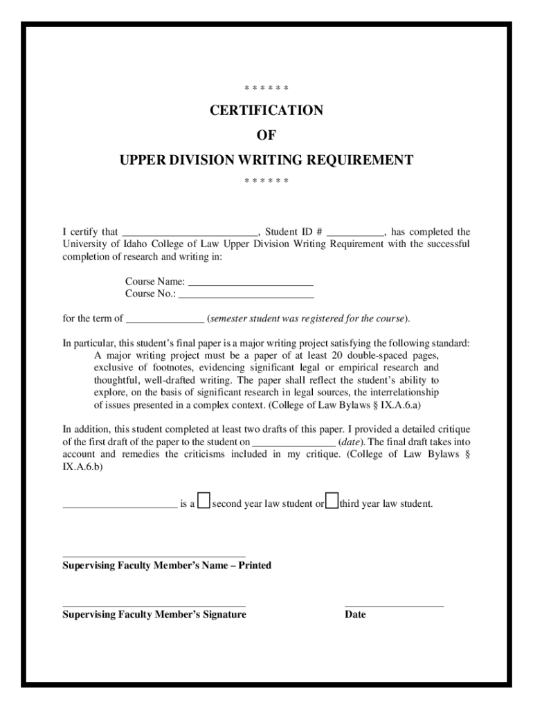 ******CERTIFICATION OF UPPER DIVISION WRITING REQUIREMENT ******I certify that ___, Student ID # ___, has completed the University of Idaho College of Law Upper Division Writing Requirement with the