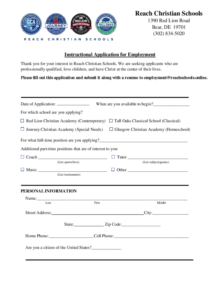 Reach Christian Schools 1390 Red Lion Road Bear, DE 19701 (302) 8345020Instructional Application for Employment Thank you for your interest in Reach Christian Schools. We are seeking applicants who