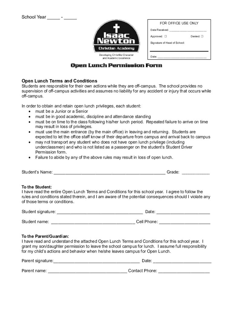 School Year ___ ___ FOR OFFICE USE ONLY Date Received: ___ Approved: Denied: Signature of Head of School:Date: ___Open Lunch Permission Form Open Lunch Terms and Conditions Students are responsible