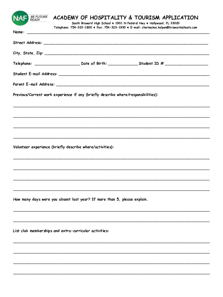 ACADEMY OF HOSPITALITY & TOURISM APPLICATION South Broward High School 1901 N Federal Hwy Hollywood, FL 33020 Telephone: 7543231800 Fax: 7543231930 Email: charmaime.kalpen@browardschools.comName: