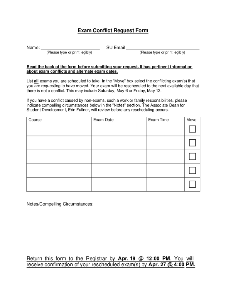 Exam Conflict Request Form Name:(Please type or print legibly)SU Email(Please type or print legibly)Read the back of the form before submitting your request. It has pertinent information about exam
