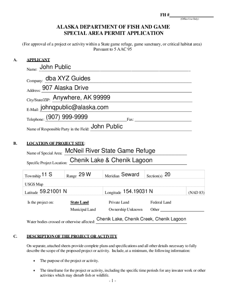 FH # (Office Use Only)ALASKA DEPARTMENT OF FISH AND GAME SPECIAL AREA PERMIT APPLICATION (For approval of a project or activity within a State game refuge, game sanctuary, or critical habitat area)