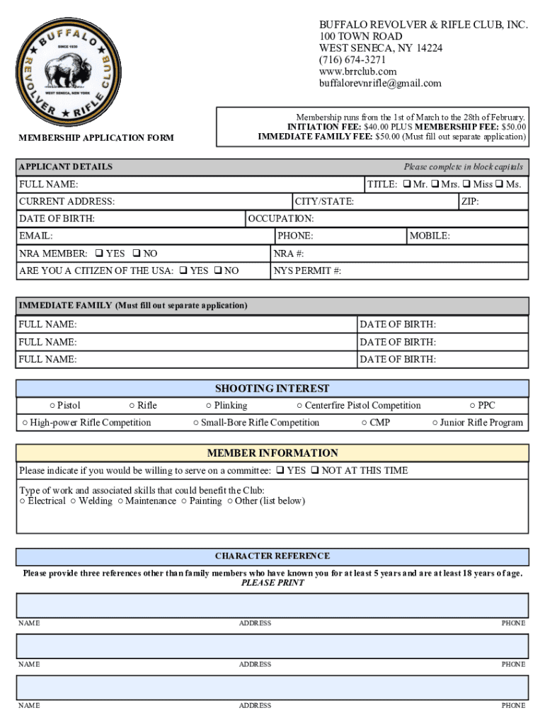 BUFFALO REVOLVER & RIFLE CLUB, INC. 100 TOWN ROAD WEST SENECA, NY 14224 (716) 6743271 www.brrclub.com buffalorevnrifle@gmail.com Membership runs from the 1st of March to the 28th of February. INITIATION