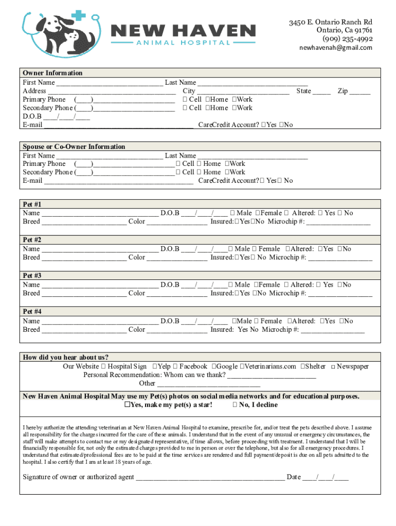 3450E. OntarioRanchRd Ontario,Ca91761 (909)2354992 newhavenah@gmail.com OwnerInformation FirstName___LastName___ Address___ City___ State___ Zip___ PrimaryPhone (___)___ Cell Homework SecondaryPhone(___)___