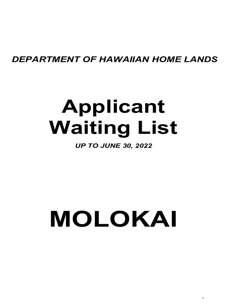 DEPARTMENT OF HAWAIIAN HOME LANDSApplicant Waiting List UP TO JUNE 30, 2022MOLOKAI1DHHL Molokai Island Waitlist as of June 30, 2022Directory of Contents *PagesSections1Title Page2Directory of Contents3Statewide