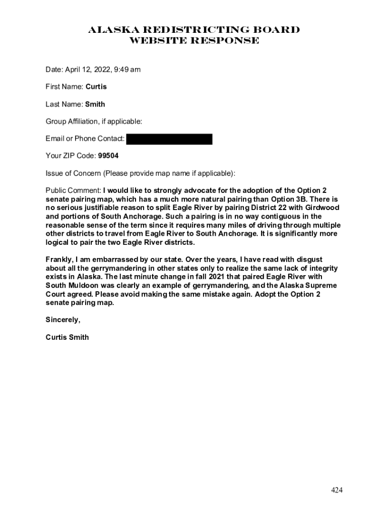 ALASKA REDISTRICTING BOARD WEBSITE RESPONSE Date: April 12, 2022, 9:49 am First Name: Curtis Last Name: Smith Group Affiliation, if applicable: Email or Phone Contact: Your ZIP Code: 99504 Issue of