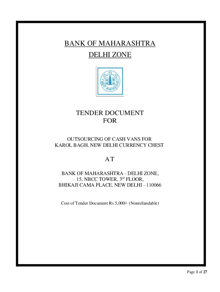 BANK OF MAHARASHTRA DELHI CONTENDER DOCUMENT FOR OUTSOURCING OF CASH VANS FOR KAROL BAG, NEW DELHI CURRENCY CHEST AT BANK OF MAHARASHTRA DELHI ZONE, 15, NBC TOWER, 3rd FLOOR, BHAJI CAME PLACE, NEW