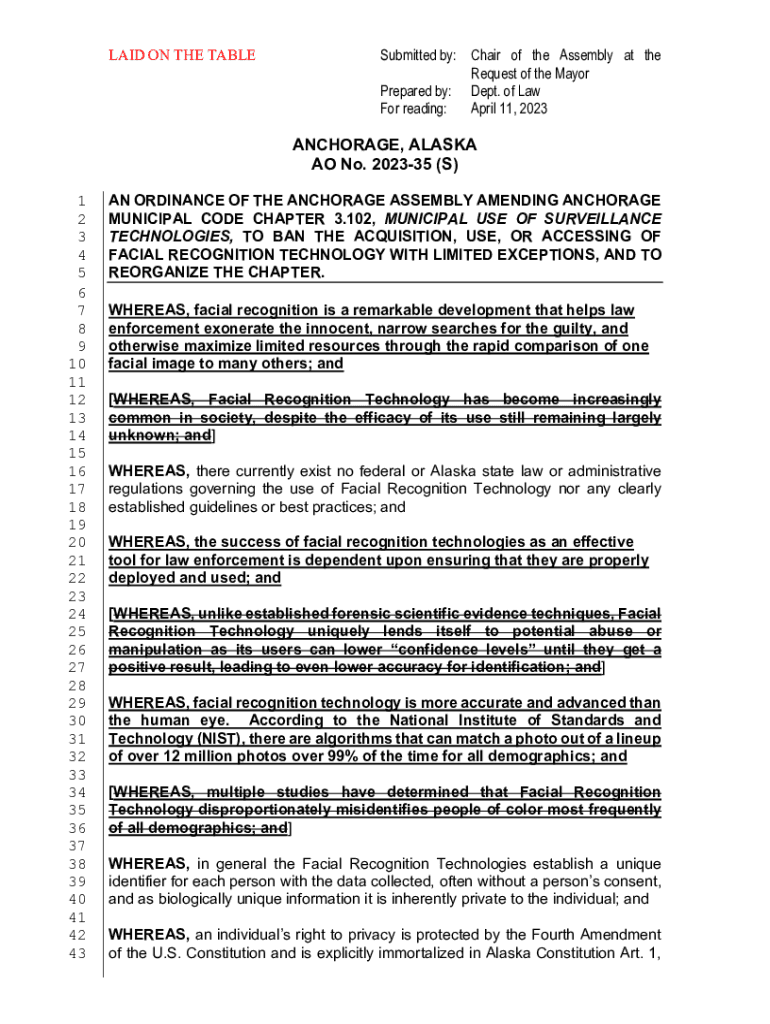 LAID ON THE TABLESubmitted by: Chair of the Assembly at the Request of the Mayor Prepared by: Dept. of Law For reading: April 11, 2023ANCHORAGE, ALASKA AO No. 202335 (S) 1 2 3 4 5 6 7 8 9 10 11 12