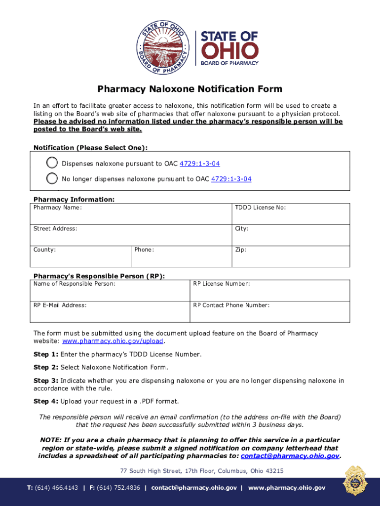 Pharmacy Naloxone Notification Form In an effort to facilitate greater access to naloxone, this notification form will be used to create a listing on the Boards website of pharmacies that offer naloxone