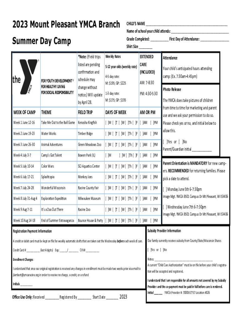 2023 Mount Pleasant YMCA Branch Summer Day Campaniles NAME ___ Name of school your child attends: ___ Grade Completed: ___ First Day of Attendance: ___ Shirt Size ___*Note: (Field trips listed are
